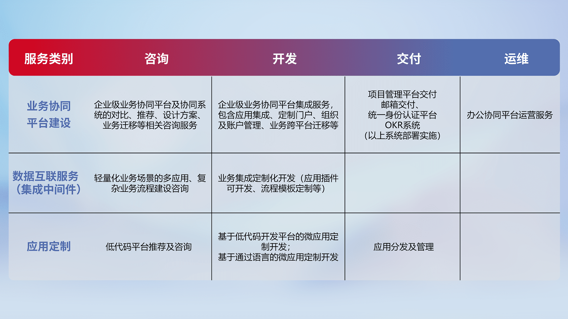 针对钉钉、、、企微、、IDaas等平台级产品提供产品的规划、、方案、、、交付、、、、定制化开发等服务,,,,实现如统一协同办公、、、、智能客户服务、、、混合会议管理、、智能数据查询、、等业务场景,,实现数字化转型。。。。